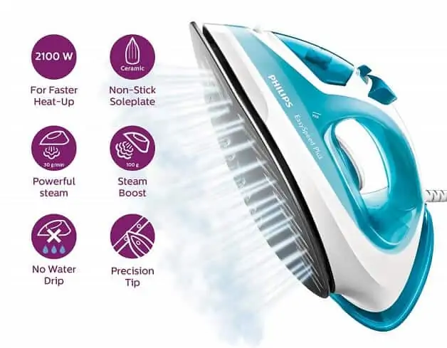 It is one of the best steam irons at an affordable price. The non-stick soleplate and triple precision tip will distribute the heat & steam (30g/minute and 100g steam boost) evenly to iron your clothes quickly with few strokes. However, it has a few issues with water leakage and also using high settings while it is not completely ready will cause injury to steam spray system.